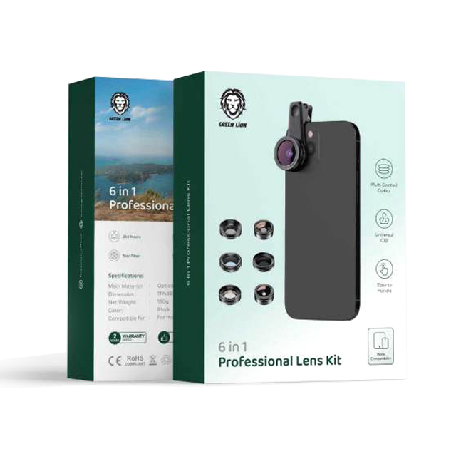 The Green Lion 6 in 1 Professional Lens Kit is an indispensable tool for photography enthusiasts looking to elevate their mobile photography. Its wide compatibility makes it suitable for use with a variety of smartphones and tablets. The kit is easy to handle and comes with a universal clip for effortless attachment. The multi-coated optics ensure high-quality images with exceptional clarity. The 25x macro lens is perfect for detailed close-ups, while the 140-degree super wide-angle lens captures expansive landscapes. For a unique perspective, the 250-degree fisheye lens provides dramatic curvature. The CPL filter reduces reflections and enhances color saturation, and the ND32 filter effectively reduces light intake for balanced exposures. This comprehensive kit is ideal for capturing professional-grade photos on-the-go.