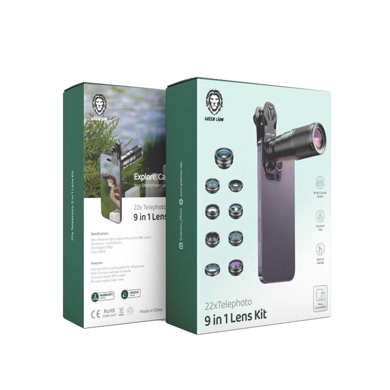 The Green Lion 9 in 1 Lens Kit is an extraordinary photography accessory designed for mobile photographers. It comes packed in a portable, stylish zipper case that keeps all lenses safe and organized. The multi-coated optics ensure crisp, high-quality images. Featuring a 22x telephoto lens, you can capture stunning details from a distance. The kit also includes a 198-degree fisheye lens for a unique, spherical perspective, and two kaleidoscope lenses (3 and 6) that add an artistic touch to your photographs. The CPL filter lens reduces glare, while the 0.63x wide-angle lens paired with a 15x macro lets you take expansive or close-up shots. The flow and radial filter lenses add creative flares and focus effects. With a universal clip and wide compatibility, this easy-to-handle kit is an asset for photography lovers.