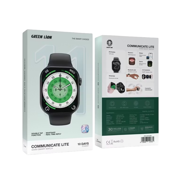The Green Lion Communicate Lite 42mm Smart Watch is the best smart watch choice. It has a 1.85 inch IPS display with HD clear visuals, perfect for reading your notifications. The 230mAh battery gives you 2-3 days of use and up to 10 days on standby. With 684KB of RAM and 256MB of storage, it runs as fast as possible. It also features Bluetooth 3.0 + 5.4 for easy connection and wireless charging to make you comfortable. You can choose over 500 watch faces and enjoy the always-on display. The watch has a compass for extra functionality and a dynamic island design. Whether you’re working inside or outside, the Green Lion Communicate Lite Smart Watch keeps you connected and looking good.