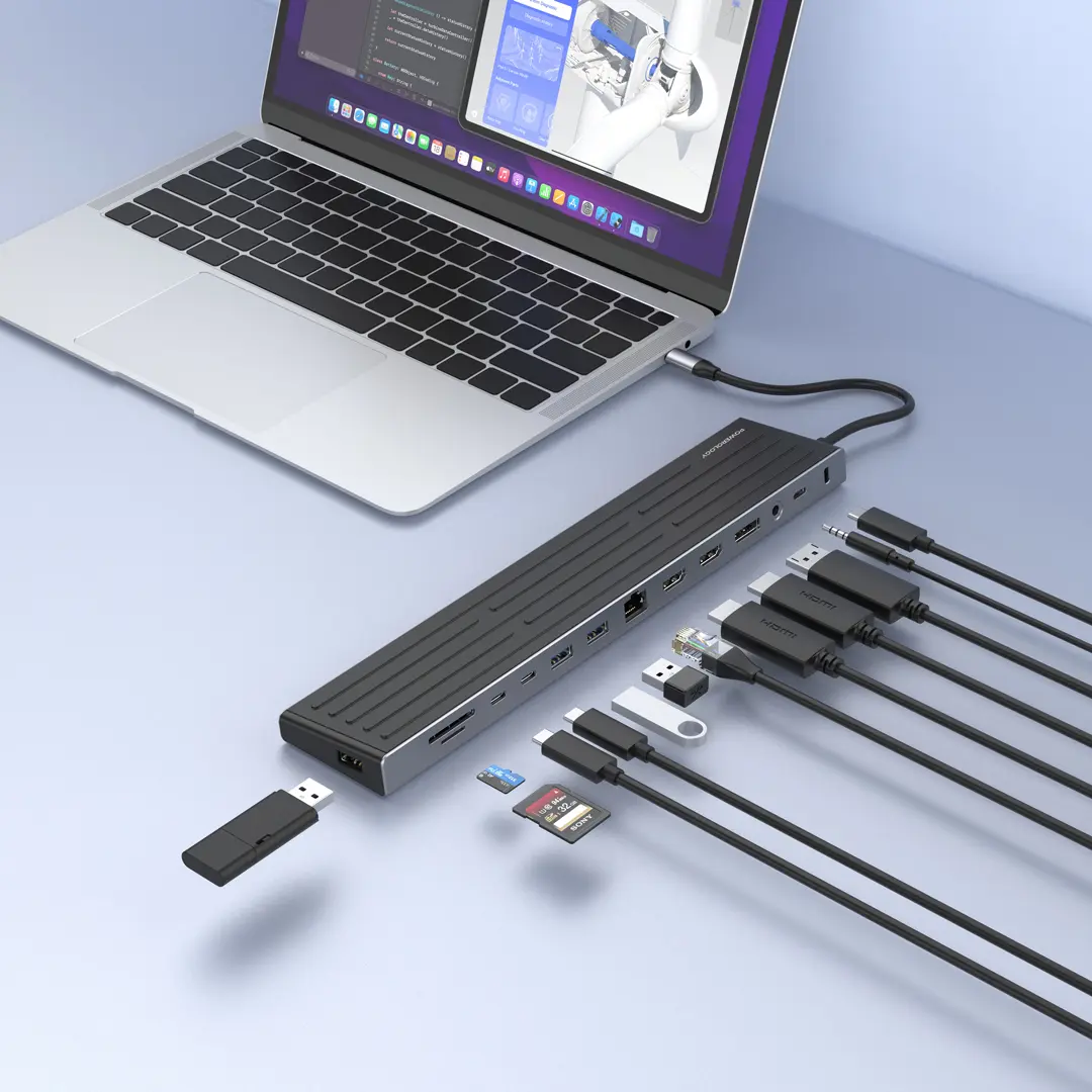 The Powerology Nexis 13-in-1 Multi-Display USB-C Hub & Laptop Stand is the superlative enhancing workstation for you. With USB-C PD input for 100W power delivery, this hub offers massive connectivity with 3 USB-A ports and 2 USB-C ports, all supporting 5Gbps data transfer. For high-grade display, it supports dual HDMI ports and a Display Port delivering 4K UHD @60Hz resolution, along with SD & TF memory card slots for quick transfer of files, a 3.5mm auxiliary jack, and an RJ45 Ethernet port with transfer speeds up to 1000Mbps. Constructed out of robust aluminum, this hub will guarantee solid performance and give a very classy look to your setup. With compatibility for Windows, Mac, iOS, and Android, this gives the most versatile tools for any tech setup. For extra convenience and security, it also integrates the laptop stand into this product, making it a great fit for work and play alike.