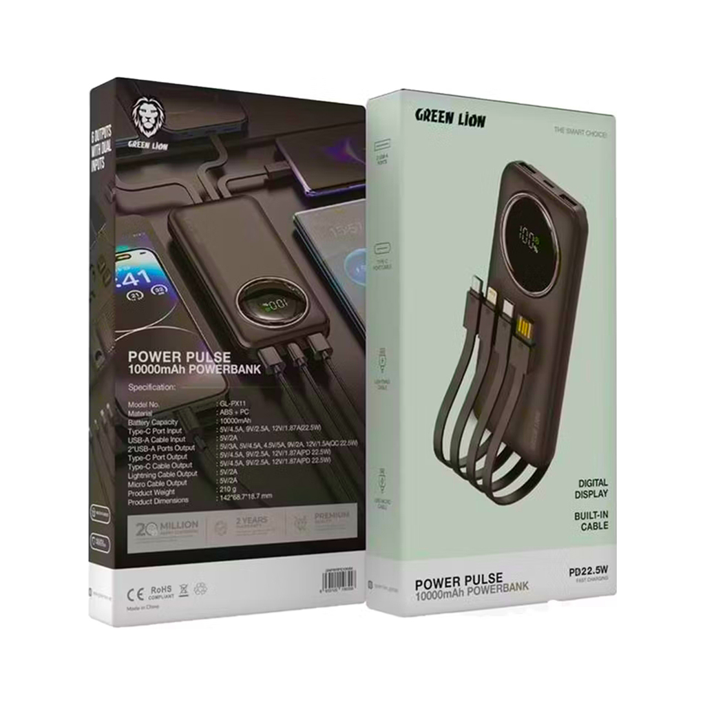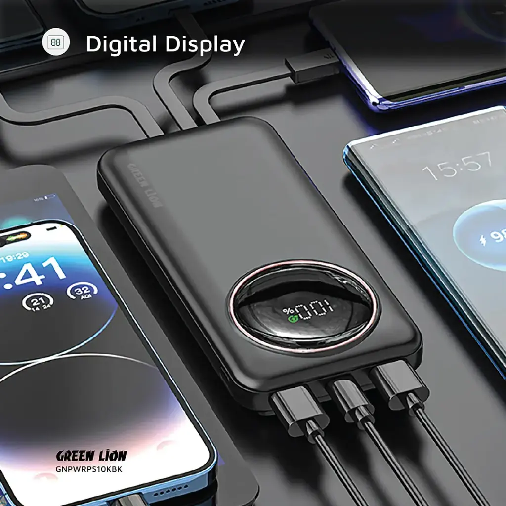 The Green Lion Power Pulse 10000mAh Power bank is an adaptable, reliable means through which to maintain a positive charging status on the go. Crafted from ABS and PC, it’s strong enough to boast up to 10000mAh in real battery capacity- a powerhouse for any device. Equipped with a number of input and output options, this power bank supports fast charging via its Type-C port and cable-PD 22.5W and USB-A ports-QC 22.5W to give flexibility for various devices. Further, it has built-in Lightning and Micro cables to accommodate a wide range of charging needs. The digital display on the power bank keeps you informed about the remaining battery life, while the built-in cables add convenience, as one doesn’t need to carry any extra accessories. With its 22.5W fast charging capability, it is supposed to efficiently deliver power and is perfect for smartphones, tablets, and other USB-powered devices. The Green Lion Power Pulse is the ultimate portable charging companion, compact in design and with advanced features.